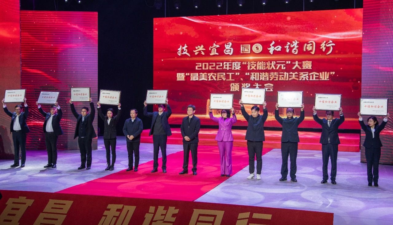 1月7日,宜昌市第三届劳动关系十佳和谐企业评选活动颁奖典礼在宜昌市广电中心一号演播大厅隆重举行。典礼表彰了宜昌市创建“劳动关系十佳和谐企业”及“最美农民工”“技能状元”代表,OD体育宜昌有限公司荣获宜昌市第三届“十佳和谐企业”称号。